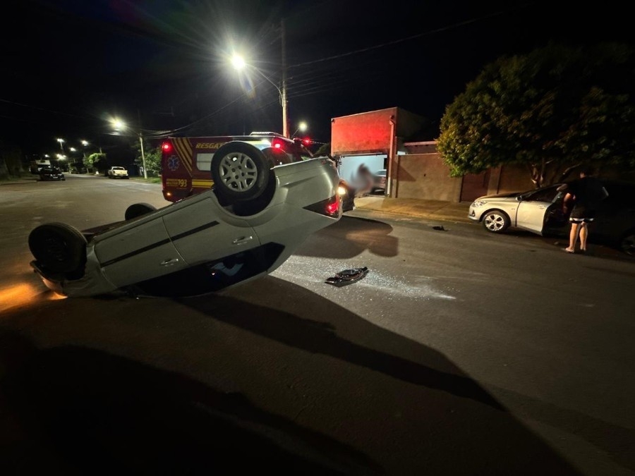 Carro capota após colisão com veículos estacionados no Bairro Itapoã, em Ivinhema