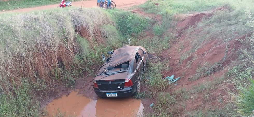 Veículo GM/Corsa Sedan capotou e parou dentro de caixa de contenção de água às margens da Avenida - Fotos: Angélica Notícias