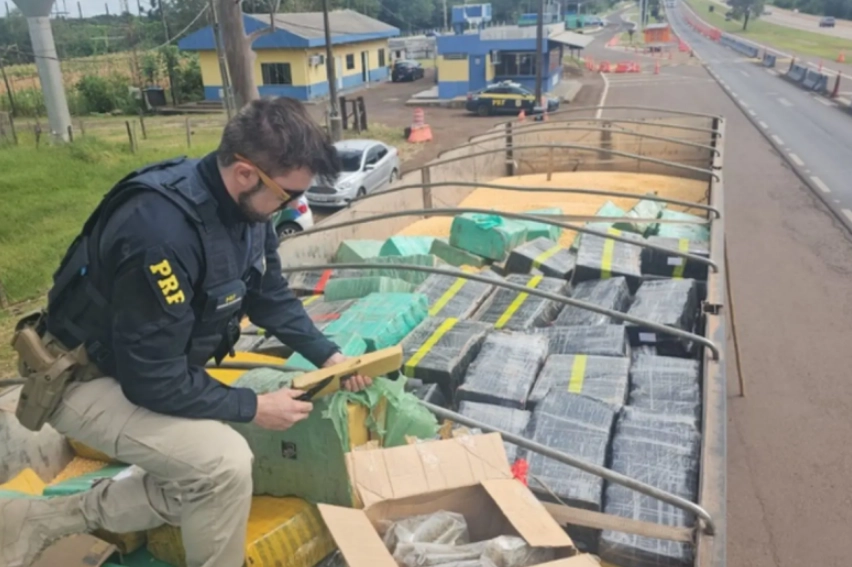 Durante a fiscalização, os policiais localizaram uma grande quantidade de drogas escondida em meio a uma carga de milho. Ao todo, foram apreendidos 5.401 quilos de maconha, 21,1 quilos de haxixe e 3,6 quilos de capulho.