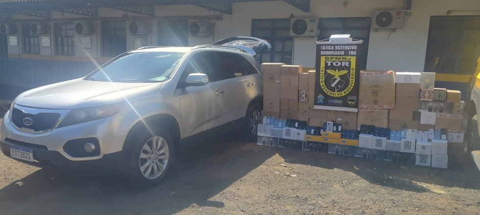 Em vistoria no veículo, foram localizados 1.046 frascos de perfumes, aparelhos celulares, displays e baterias de iPhone, além de outros produtos eletrônicos, todos sem documentação fiscal.
