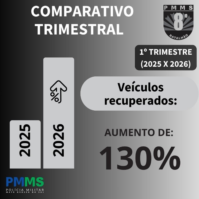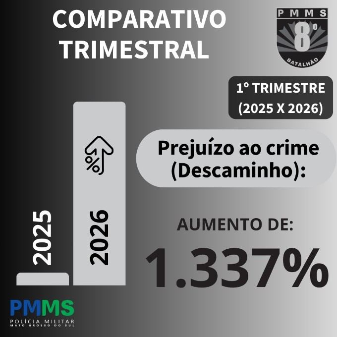 O 8º Batalhão de Polícia Militar divulgou o balanço comparativo do primeiro trimestre de 2025 e 2026, apontando avanço nos resultados operacionais e indicadores positivos na segurança pública na área de atuação da unidade, que atende o Vale do Ivinhema.