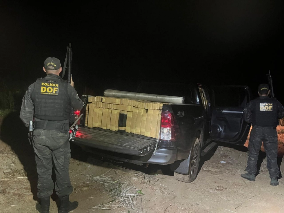 Ainda durante as diligências, já em outra frente da operação, equipes do DOF e do 3º BPM localizaram uma Ford Ranger abandonada em via urbana, onde foram apreendidos 1.980 quilos de maconha e 28,3 quilos de skunk, distribuídos em diversos fardos no interior da caminhonete.