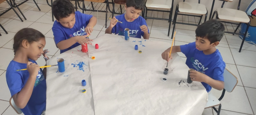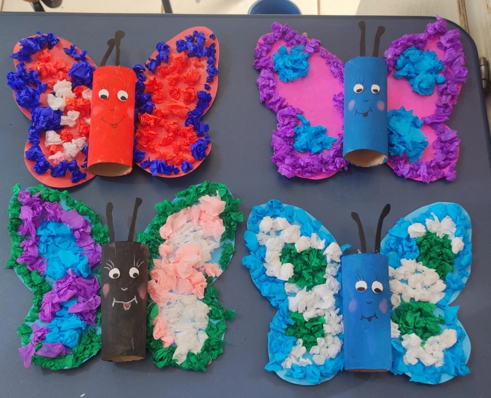 A atividade incentivou a reutilização de materiais e abordou, de forma simples, o cuidado com o meio ambiente. Com o apoio das monitoras sociais, as crianças produziram borboletas com rolinhos de papel higiênico e papel crepom, trabalhando cores, formas e coordenação.
