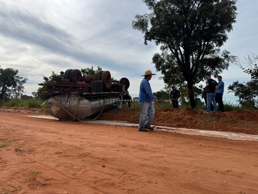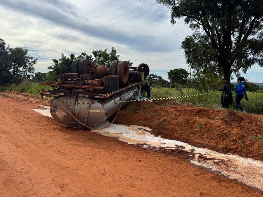 De acordo com informações apuradas no local, o caminhão, que estava carregado com leite, seguia pela estrada rural quando, por motivos ainda a serem esclarecidos, acabou tombando.