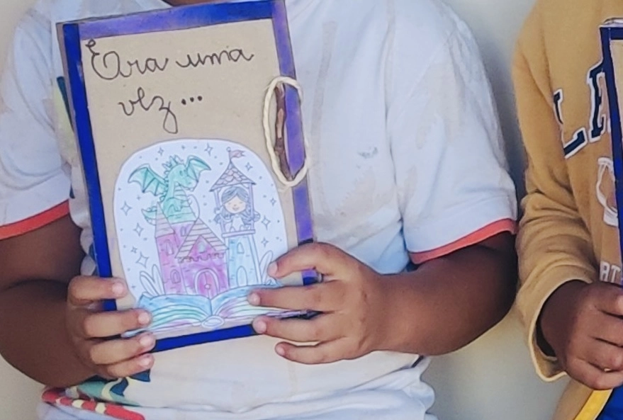Durante a atividade, os participantes da turma "Sementinha" produziram um “livro ecológico” a partir de caixas de papelão e outros materiais recicláveis. A proposta envolveu a construção coletiva de histórias, aliando contação e ilustração, com participação ativa das crianças no desenvolvimento do enredo, sob mediação das monitoras sociais.